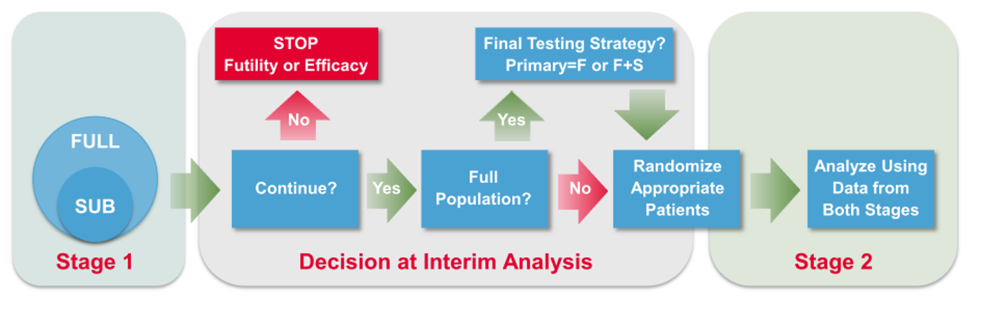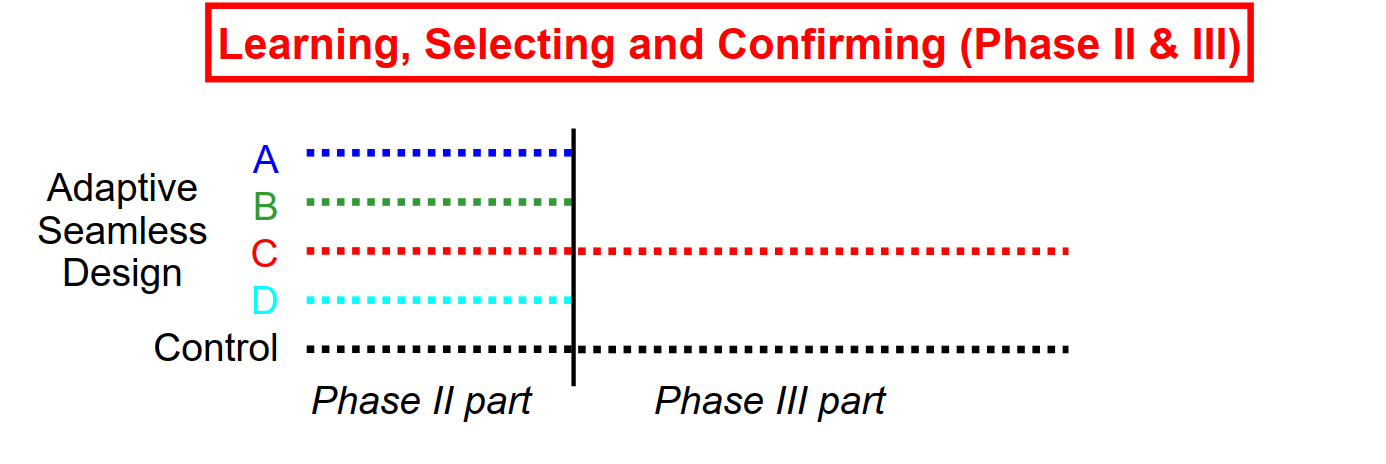 - Conduct phase II trial as internal part of a combined trial - Plan phase III trial based on data from phase II part - Conduct phase III trial as internal part of the same trial - Demonstrate efficacy with data from phase III + II part
