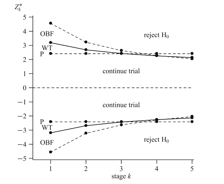 Wang and Tsiatis \(\Delta\)-class \(u_k = k^{\Delta-0.5}\). O’Brien and Fleming: \(\Delta\) = 0; Pocock: \(\Delta\) = 0.5